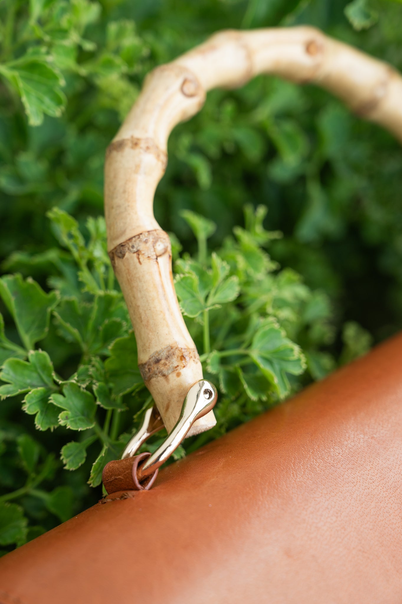 A perfect blend of timeless craftsmanship and contemporary elegance, this artisanal Delia Wicker Top Handle Satchel is handcrafted from tightly woven wicker, offering both durability and natural charm. The structured silhouette is complemented by a smooth, vegetable-tanned leather flap, adding a refined contrast to the organic texture. A sturdy bamboo top handle lends an exotic yet sophisticated touch, making it a true statement piece.